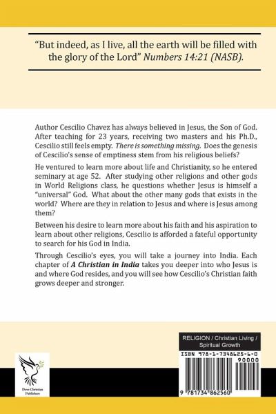 "But indeed, as I live, all the earth will be filled with the glory of the Lord" Numbers 14:21 (NASB). Author Cescilio Chavez has always believed in Jesus, the Son of God. After teaching for 23 years, receiving two masters and his Ph.D., Cescilio still feels empty. There is something missing. Does the genesis of Cescilio's sense of emptiness stem from his religious beliefs? He ventured to learn more about life and Christianity, so he entered seminary at age 52. After studying other religions and other gods in World Religions class, he questions whether Jesus is himself a "universal" God. What about the other many gods that exists in the world? Where are they in relation to Jesus and where is Jesus among them? Between his desire to learn more about his faith and his aspiration to learn about other religions, Cescilio is afforded a fateful opportunity to search for his God in India. Through Cescilio's eyes, you will take a journey into India. Each chapter of A Christian in India takes you deeper into who Jesus is and where God resides, and you will see how Cescilio's Christian faith grows deeper and stronger.