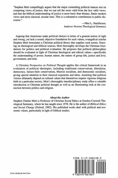 Arguing that Americans make political choices in terms of a general notion of right and wrong, yet lack a sound, objective foundation for such values, evangelical scholar Stephen Mott formulates a Christian political theory that supplies such norms. Drawing on theological and biblical sources, Mott thoroughly develops the biblical and theological foundations for politics and political evaluation. Mott proposes that political philosophies should be evaluated in light of Christian theological and ethical values--specifically the understanding of power, human nature, the nature of group life, justice and love, government, and time. He then applies this critical framework in an evaluation of political ideologies, including traditional conservatism, liberalism, democracy, laissez-faire conservatism, Marxist socialism, and democratic socialism. He gives special attention to their classical exponents and ideas. Asserting that political visions ultimately depend on cultural values that themselves require vigorous religious faith in a particular society, Mott's study offers a valuable introduction to Christian political thought as well as an illuminating look at the connection between politics and religion.