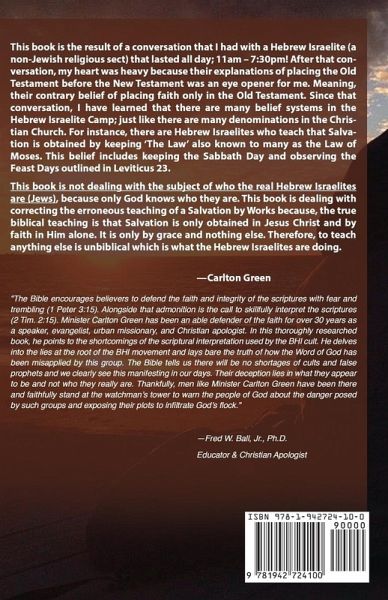 This book is the result of a conversation that I had with a Hebrew Israelite (a non-Jewish religious sect) that lasted all day; 11am - 7:30pm! After that conversation, my heart was heavy because their explanations of placing the Old Testament before the New Testament was an eye opener for me. Meaning, their contrary belief of placing faith only in the Old Testament. Since that conversation, I have learned that there are many belief systems in the Hebrew Israelite Camp; just like there are many denominations in the Christian Church. For instance, there are Hebrew Israelites who teach that Salvation is obtained by keeping 'The Law' also known to many as the Law of Moses. This belief includes keeping the Sabbath Day and observing the Feast Days outlined in Leviticus 23. This book is not dealing with the subject of who the real Hebrew Israelites are (Jews), because only God knows who they are. This book is dealing with correcting the erroneous teaching of a Salvation by Works because, the true biblical teaching is that Salvation is only obtained in Jesus Christ and by faith in Him alone. It is only by grace and nothing else.