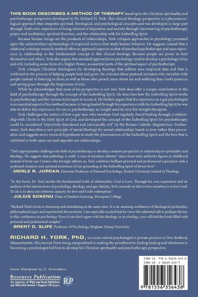 This book describes a method of therapy based upon the Christian spirituality and psychotherapy perspective developed by Dr. Richard York. This clinical theology perspective is a phenomenological approach that integrates spiritual, theological, and psychological concepts and was developed in large part through York's own experience of being relieved of depression and anxiety through interweaving of psychotherapy, prayer and meditation, spiritual direction, and the relationship with his Indwelling Spirit. Because human beings are the products of relationships, York critiques approaches to psychology premised upon the subject/object epistemology of empirical science that study human behavior. He suggests instead that a relational-ontology research method offers an approach superior to that of standard psychotherapy and uses experience in relationship as the fundamental concept in this clinical theology. Because people are prone to hurt themselves and others, York also argues that standard approaches to psychology need to develop a psychology of sin and evil, including some form of a Higher Power, as essential parts of the spiritual aspect of psychotherapy. York critiques Christian theologians for developing theology that seldom uses empirical data and that is irrelevant to the process of helping people heal and grow. He criticizes those pastoral ministers who moralize with people instead of listening to them as well as those who preach more about sin and suffering than God's presence and saving grace through the forgiveness of sins. While he acknowledges that most of his perspective is not new, York does offer a unique contribution to the field of psychotherapy through the concept of the Indwelling Spirit. He describes how the Indwelling Spirit works in psychotherapy and the various techniques to access it. He further argues that his experience as a gay psychologist is an essential aspect of his method because in being healed through his experience with his Indwelling Spirit he was able to define this experience for use in psychotherapy, an insight used by very few straight therapists. York challenges the notion of how a gay man who worships God regularly, found healing through a relationship with Christ in the Holy Spirit of God, and developed the concept of the Indwelling Spirit for psychotherapy, could be considered ""objectively disordered and intrinsically evil"" by the Roman Catholic Magisterium. Furthermore, York describes a new principle of moral theology for sexual relationships based on love rather than procreation and suggests seven research hypotheses to study the phenomenon of the Indwelling Spirit and the love that is exhibited in both same-sex and opposite-sex relationships.
