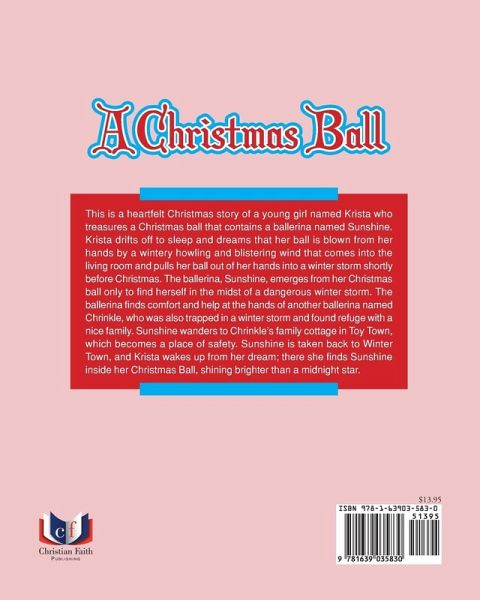 This is a heartfelt Christmas story of a young girl named Krista who treasures a Christmas ball that contains a ballerina named Sunshine. Krista drifts off to sleep and dreams that her ball is blown from her hands by a wintery howling and blistering wind that comes into the living room and pulls her ball out of her hands into a winter storm shortly before Christmas. The ballerina, Sunshine, emerges from her Christmas ball only to find herself in the midst of a dangerous winter storm. The ballerina finds comfort and help at the hands of another ballerina named Chrinkle, who was also trapped in a winter storm and found refuge with a nice family. Sunshine wanders to Chrinkle's family cottage in Toy Town, which becomes a place of safety. Sunshine is taken back to Winter Town, and Krista wakes up from her dream; there she finds Sunshine inside her Christmas Ball, shining brighter than a midnight star.