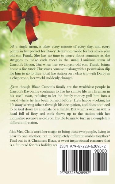 As a single mom, it takes every minute of every day, and every penny in her pocket for Darcy Beller to provide for her seven-year-old son, Frank. She has no time to worry about romance as she struggles to make ends meet in the small Louisiana town of Carson's Bayou. But when Frank brings home a fire truck Christmas ornament, along with a permission slip for him to go to their local fire station on a class trip with Darcy as a chaperone, her world suddenly changes. Even though Blaze Carson's family are the wealthiest people in Carson's Bayou, he continues to live his simple life as a fireman in his small town, refusing to let the family money pull him into a world where he has been burned before. He's happy working his life away serving others through his occupation and does not need to be tied down by a female or a family. But when a woman with a head full of fiery red curls shows up at the station with her inquisitive seven-year-old son, his life begins to turn in a completely different direction. Can Mrs. Claus work her magic to bring these two people together, living so near one another, but in completely different worlds? Find out in A Christmas Blaze, a sweet inspirational romance that is a fun read for this holiday season.