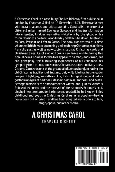 Do you want to read A Christmas Carol? If so then keep reading... A Christmas Carol is a novella by Charles Dickens, first published in London by Chapman & Hall on 19 December 1843. The novella met with instant success and critical acclaim. Carol tells the story of a bitter old miser named Ebenezer Scrooge and his transformation into a gentler, kindlier man after visitations by the ghost of his former business partner Jacob Marley and the Ghosts of Christmases Past, Present and Yet to Come. The book was written at a time when the British were examining and exploring Christmas traditions from the past as well as new customs such as Christmas cards and Christmas trees. Carol singing took a new lease on life during this time. Dickens' sources for the tale appear to be many and varied, but are, principally, the humiliating experiences of his childhood, his sympathy for the poor, and various Christmas stories and fairy tales. Dickens' Carol was one of the greatest influences in rejuvenating the old Christmas traditions of England, but, while it brings to the reader images of light, joy, warmth and life, it also brings strong and unforgettable images of darkness, despair, coldness, sadness, and death. Scrooge himself is the embodiment of winter, and, just as winter is followed by spring and the renewal of life, so too is Scrooge's cold, pinched heart restored to the innocent goodwill he had known in his childhood and youth. A Christmas Carol remains popular-having never been out of print-and has been adapted many times to film, stage, opera, and other media. What are you waiting for A Christmas Carol is one click away, select the "Buy Now" button in the top right corner NOW!