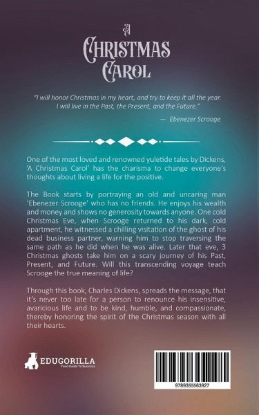A Christmas Carol, which is a Christmas ghost story, opens up on a frigid Christmas Eve in London, where Ebenezer Scrooge is personified as an unkind man who is rude in his behavior towards his nephew who invited him on Christmas. The novel's main plot is around Ebenezer Scrooge, who meets the spirit of his deceased business partner, who warns him to avoid the same fate as he did while alive. Scrooge was afterward visited by the ghosts of Christmas Past, Present, and Future, who made him travel through the 3 phases of his life respectively. The ghost of Christmas Future showed him the vision…mehr