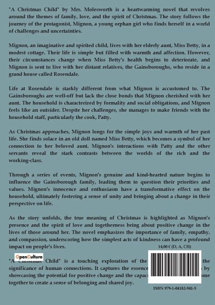 "A Christmas Child" by Mrs. Molesworth is a heartwarming novel that revolves around the themes of family, love, and the spirit of Christmas. The story follows the journey of the protagonist, Mignon, a young orphan girl who finds herself in a world of challenges and uncertainties. Mignon, an imaginative and spirited child, lives with her elderly aunt, Miss Betty, in a modest cottage. Their life is simple but filled with warmth and affection. However, their circumstances change when Miss Betty's health begins to deteriorate, and Mignon is sent to live with her distant relatives, the Gainsboroughs, who reside in a grand house called Rosendale. Life at Rosendale is starkly different from what Mignon is accustomed to. The Gainsboroughs are well-off but lack the close bonds that Mignon cherished with her aunt. The household is characterized by formality and social obligations, and Mignon feels like an outsider. Despite her challenges, she manages to make friends with the household staff, particularly the cook, Patty. As Christmas approaches, Mignon longs for the simple joys and warmth of her past life. She finds solace in an old doll named Miss Betty, which becomes a symbol of her connection to her beloved aunt. Mignon's interactions with Patty and the other servants reveal the stark contrasts between the worlds of the rich and the working-class. Through a series of events, Mignon's genuine and kind-hearted nature begins to influence the Gainsborough family, leading them to question their priorities and values. Mignon's innocence and enthusiasm have a transformative effect on the household, ultimately fostering a sense of unity and bringing about a change in their perspective on life. As the story unfolds, the true meaning of Christmas is highlighted as Mignon's presence and the spirit of love and togetherness bring about positive change in the lives of those around her. The novel emphasizes the importance of family, empathy, and compassion, underscoring how the simplest acts of kindness can have a profound impact on people's lives. "A Christmas Child" is a touching exploration of the power of love and the significance of human connections. It captures the essence of the holiday season by showcasing the potential for positive change and the capacity for individuals to come together to create a sense of belonging and shared joy.