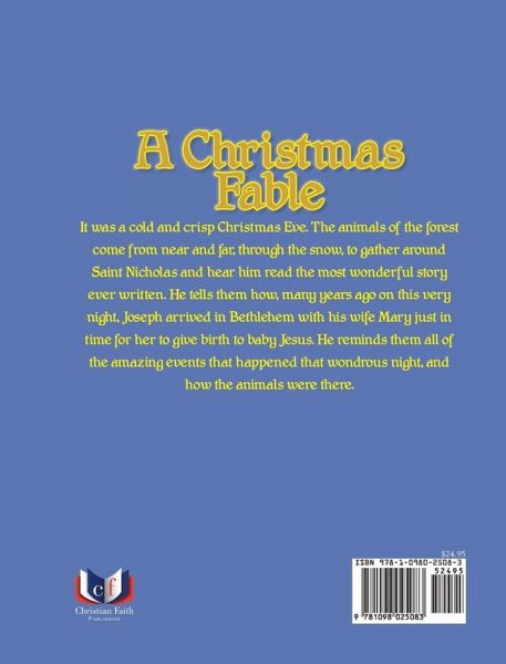 It was a cold and crisp Christmas Eve. The animals of the forest come from near and far, through the snow, to gather around Saint Nicholas and hear him read the most wonderful story ever written. He tells them how, many years ago on this very night, Joseph arrived in Bethlehem with his wife Mary just in time for her to give birth to baby Jesus. He reminds them all of the amazing events that happened that wondrous night, and how the animals were there.