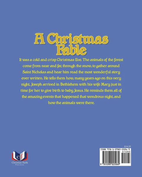 It was a cold and crisp Christmas Eve. The animals of the forest come from near and far, through the snow, to gather around Saint Nicholas and hear him read the most wonderful story ever written. He tells them how, many years ago on this very night, Joseph arrived in Bethlehem with his wife Mary just in time for her to give birth to baby Jesus. He reminds them all of the amazing events that happened that wondrous night, and how the animals were there.