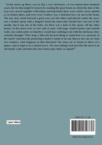 " In the street, up there, was an old, a very old house,¿it was almost three hundred years old, for that might be known by reading the great beam on which the date of the year was carved: together with tulips and hop-binds there were whole verses spelled as in former times, and over every window was a distorted face cut out in the beam. The one story stood forward a great way over the other; and directly under the eaves was a leaden spout with a dragon's head; the rain-water should have run out of the mouth, but it ran out of the belly, for there was a hole in the spout. All the other houses in the street were so new and so neat, with large window-panes and smooth walls, one could easily see that they would have nothing to do with the old house: they certainly thought, "How long is that old decayed thing to stand here as a spectacle in the street? And then the protecting windows stand so far out, that no one can see from our windows what happens in that direction! The steps are as broad as those of a palace, and as high as to a church tower. The iron railings look just like the door to an old family vault, and then they have brass tops, that's so stupid!""