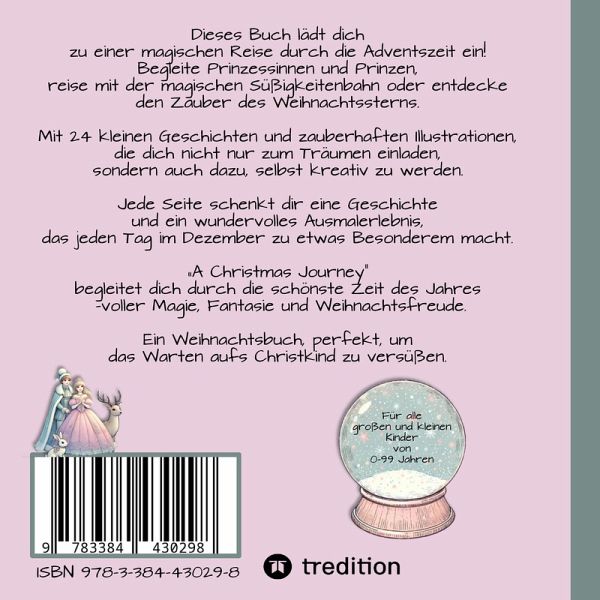 Tauche ein in die magische Welt von "A Christmas Journey" - 24 Twinkle Tales, dem perfekten Begleiter durch die Adventszeit! Dieses liebevoll gestaltete Buch vereint 24 zauberhafte Geschichten mit wunderschönen Illustrationen, die nicht nur Kinderaugen zum Leuchten bringen.Jeder Tag in der Vorweihnachtszeit wird zu einem kleinen Zauber: Tauche ein in märchenhaften Winterwelten, reise mit einer magischen Süßigkeitenbahn oder entdecke den funkelnden Weihnachtsstern. Die fantasievollen Geschichten sind kurzgehalten, sodass sie sich ideal für das tägliche Lesen in der gemütlichen Adventsstimmung eignen - sei es vor dem Kamin, auf dem Sofa oder unter dem leuchtenden Weihnachtsbaum.Das Besondere an diesem Buch: "A Christmas Journey" 24 Twinkle Tales, gibt es in 3 Varianten.Durch die drei einzigartigen Varianten - wird jedes Buch auf seine Weise zum ganz individuellen Erlebnis, jedes mit seinen besonderen Vorzügen.In der einzigartigen Softcover Version lassen sich die Bilder nicht nur ausmalen, sondern regen auch die Fantasie an und laden dazu ein, eigene Farben in die Geschichten zu bringen. So wird jedes Exemplar zu einem individuellen Kunstwerk.Leider wird meist zum "Reinlesen" nur die Vorschau des Innenteils der Softcover Variante angezeigt.Diese ist, wie du dann siehst, schwarz-weiß gehalten, denn in dieser einzigartigen Softcover-Version kannst du die Geschichte selbst zum Leben erwecken! Die liebevoll gestalteten Ausmalbilder warten nur darauf, von dir mit Farbe gefüllt zu werden. Nimm also deine Buntstifte und tauche ein - mach dich bereit für einen Zauber, der mit jedem Hauch von Farbe durch dich lebendiger wird.Die Ausmalbilder machen die Softcover-Version zu einem interaktiven Erlebnis. Kinder können die Szenen farbenfroh gestalten, und auch Erwachsene, die die Ruhe und Freude am Ausmalen genießen, kommen hier auf ihre Kosten.Die Hardcover-Version bietet ein hochwertiges Leseerlebnis, das ideal für alle ist, die das Buch als liebevoll gestalteten Schatz in ihrem Regal bewahren möchten. Mit seinen farbigen Seiten und dem stabilen Einband eignet es sich perfekt zum Vorlesen und gemeinsamen Entdecken in der Familie.Hier ist allerdings zu beachten, dass die Illustrationen jedoch weiterhin in schwarz-weiß gehalten sind und nicht dazu gedacht sind, koloriert zu werden, wodurch der künstlerische Stil der Geschichte bewahrt wird.Das E-Book ist die umweltfreundliche, leicht zugängliche Variante für alle, die Geschichten gerne überall und jederzeit griffbereit haben. Es passt problemlos ins Reisegepäck und ist sofort verfügbar - ideal für unterwegs und für all jene, die auf nachhaltiges Lesen setzen.Hier ist ebenfalls zu beachten, dass die Illustrationen weiterhin in schwarz-weiß gehalten sind und so der künstlerische Stil der Geschichte bewahrt wird.Warum dieses Buch?"A Christmas Journey" 24 Twinkle Tales, ist für alle, die das Kind in sich bewahrt haben - ob jung oder jung gebliebenEs schenkt nicht nur Vorfreude, sondern verbindet Lesen, Kreativität und Familienzeit in einer einzigartigen Weise. Es ist mehr als ein Buch - es ist ein Erlebnis, das die Adventszeit noch magischer macht. Ob für dich selbst oder als Geschenk: Dieses Buch ist die perfekte Wahl, um die schönsten Momente des Jahres mit einem Hauch von Zauber zu bereichern.Erwecke den Zauber der Weihnacht - jeden Tag aufs Neue! Ich wünsche dir von Herzen viel Freude damit! Frohe Weihnachten!