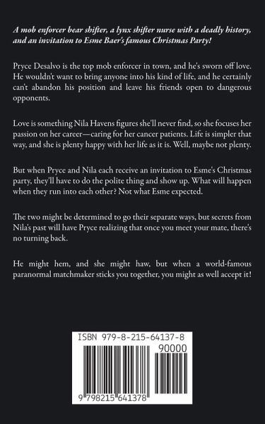 A mob enforcer bear shifter, a lynx shifter nurse with a deadly history, and an invitation to Esme Baer's famous Christmas Party! Pryce Desalvo is the top mob enforcer in town, and he's sworn off love. He wouldn't want to bring anyone into his kind of life, and he certainly can't abandon his position and leave his friends open to dangerous opponents. Love is something Nila Havens figures she'll never find, so she focuses her passion on her career—caring for her cancer patients. Life is simpler that way, and she is plenty happy with her life as it is. Well, maybe not plenty. But when Pryce and Nila each receive an invitation to Esme's Christmas party, they'll have to do the polite thing and show up. What will happen when they run into each other? Not what Esme expected. The two might be determined to go their separate ways, but secrets from Nila's past will have Pryce realizing that once you meet your mate, there's no turning back. He might hem, and she might haw, but when a world-famous paranormal matchmaker sticks you together, you might as well accept it!