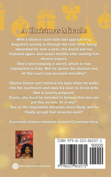 With a divorce court date fast approaching, Augusta's anxiety is through the roof. After being separated for over a year, she would see her husband again. Just seven months after serving him divorce papers. She's been keeping a secret, which is now impossible to hide. Will he ignore the obvious and let the court case proceed smoothly? Obinna Ilonze can't believe his eyes when he walks into the courtroom and sees his soon to be ex-wife. She is heavily pregnant. Surely, she must be deluded to believe that she can pin this on him. Or is she? But as the impossible becomes more likely, will he finally accept that miracles exist? A second chance romance around Christmas time.