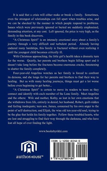 It is said that a crisis will either make or break a family. Sometimes, even the strongest of relationships can fall apart when troubles arise, and we can be shocked by the manner in which people respond to problems. Issues which were previously ignored or buried are suddenly emphasized, demanding attention, at any cost. Left ignored, the price is very high, as the family in this book discovers. "A Christmas Spirit" is an intensely emotional story about a family's journey through a very difficult and turbulent period. Already having endured many hardships, this family is fractured without even realizing it until the youngest child becomes critically ill. With Christmas approaching, the little girl's health takes a dramatic turn for the worse. Quietly, her parents and brothers begin falling apart and it doesn't take long before the fractures become enormous cracks, threatening to shatter the family completely. Four-year-old Angelina watches as her family is forced to confront its demons, and she longs for her parents and brothers to find their way to healing. But as with many healing journeys, things must get a lot worse before even beginning to get better... "A Christmas Spirit" is certain to move its readers to tears as they connect and identify with each member of the Lane family. Meet Angelina and the others: Wife and mother, Kathy, so lost in her own emotions that she withdraws from life, entirely in denial; her husband, Robert, guilt-ridden and feeling inadequate; teen son, James, consumed by his own anger to the point of self-destruction; and Elijah, the wise old ten-year-old soul, trying to be the glue that holds his family together. Follow these troubled hearts, who are lost and struggling to find their way through the darkness, and who have lost all hope of ever finding the light.