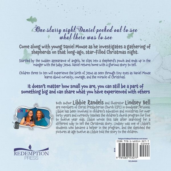 "One starry night, Daniel peeked out to see what there was to see." Come along with young Daniel Mouse as he investigates a gathering of shepherds on that long-ago, star-filled Christmas night. Startled by the sudden appearance of angels, he slips into a shepherd's pouch and ends up in the manger with the baby Jesus. Daniel returns home with a glorious story to tell. Children three to ten will experience the birth of Jesus as seen through tiny eyes as Daniel Mouse learns about curiosity, courage, and the miracle of Christmas. It doesn't matter how small you are, you can still be a part of something big and can share what you have experienced with others.