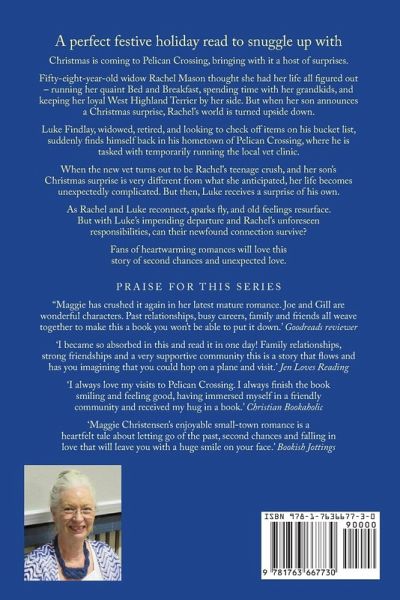 Christmas is coming to Pelican Crossing, bringing with it a host of surprises. Fifty-eight-year-old widow Rachel Mason thought she had her life all figured out - running her quaint Bed and Breakfast, spending time with her grandkids, and keeping her loyal West Highland Terrier by her side. But when her son announces a Christmas surprise, Rachel's world is turned upside down. Luke Findlay, widowed, retired, and looking to check off items on his bucket list, suddenly finds himself back in his hometown of Pelican Crossing, where he is tasked with temporarily running the local vet clinic. When the new vet turns out to be Rachel's teenage crush, and her son's Christmas surprise is very different from what she anticipated, her life becomes unexpectedly complicated. But then, Luke receives a surprise of his own. As Rachel and Luke reconnect, sparks fly, and old feelings resurface. But with Luke's impending departure and Rachel's unforeseen responsibilities, can their newfound connection survive? Fans of heartwarming romances will love this story of second chances and unexpected love.