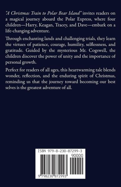 "A Christmas Train to Polar Bear Island" invites readers on a magical journey aboard the Polar Express, where four children-Harry, Keagan, Tracey, and Dave-embark on a life-changing adventure. Through enchanting lands and challenging trials, they learn the virtues of patience, courage, humility, selflessness, and gratitude. Guided by the mysterious Mr. Cogswell, the children discover the power of unity and the importance of personal growth. Perfect for readers of all ages, this heartwarming tale blends wonder, reflection, and the enduring spirit of Christmas, reminding us that the journey toward becoming our best selves is the greatest adventure of all.