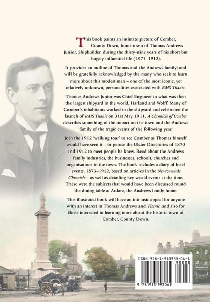 A Chronicle of Comber 1873-1912: The Town of Thomas Andrews, Shipbuilder paints an intimate picture of Comber, County Down, home town of Thomas Andrews Junior, Shipbuilder, during the thirty-nine years of his short but hugely influential life (1873-1912). It provides an outline of Thomas and the Andrews family; and will be gratefully acknowledged by the many who seek to learn more about this modest man 'one of the most iconic, yet relatively unknown, personalities associated with RMS Titanic. Thomas Andrews Junior was Chief Engineer in what was then the largest shipyard in the world, Harland and Wolff. Many of Comber's inhabitants worked in the shipyard and celebrated the launch of RMS Titanic on 31st May 1911. A Chronicle of Comber describes something of the impact on the town and the Andrews family of the tragic events of the following year. Join the 1912 walking tour to see Comber as Thomas himself would have seen it or peruse the Ulster Directories of 1870 and 1912 to meet people he knew. Read about the Andrews family industries, the businesses, schools, churches and organisations in the town. The book includes a diary of local events, 1873-1912, based on articles in the Newtownards Chronicle as well as detailing key world events at the time. These were the subjects that would have been discussed round the dining table at Ardara, the Andrews family home. This illustrated book will have an intrinsic appeal for anyone with an interest in Thomas Andrews and Titanic, and also for those interested in learning more about the historic town of Comber, County Down.