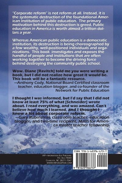 "Corporate reform" is not reform at all. Instead, it is the systematic destruction of the foundational American institution of public education. The primary motivation behind this destruction is greed. Public education in America is worth almost a trillion dollars a year. Whereas American public education is a democratic institution, its destruction is being choreographed by a few wealthy, well-positioned individuals and organizations. This book investigates and exposes the handful of people and institutions that are often working together to become the driving force behind destroying the community public school.