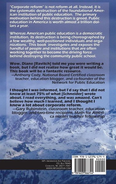 "Corporate reform" is not reform at all. Instead, it is the systematic destruction of the foundational American institution of public education. The primary motivation behind this destruction is greed. Public education in America is worth almost a trillion dollars a year. Whereas American public education is a democratic institution, its destruction is being choreographed by a few wealthy, well-positioned individuals and organizations. This book investigates and exposes the handful of people and institutions that are often working together to become the driving force behind destroying the community public school.