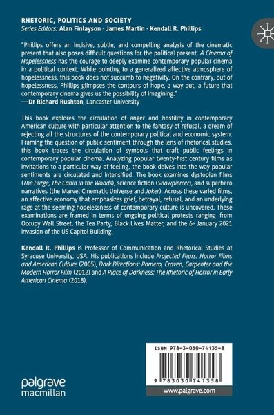 This book explores the circulation of anger and hostility in contemporary American culture with particular attention to the fantasy of refusal, a dream of rejecting all the structures of the contemporary political and economic system. Framing the question of public sentiment through the lens of rhetorical studies, this book traces the circulation of symbols that craft public feelings in contemporary popular cinema. Analyzing popular twenty-first century films as invitations to a particular way of feeling, the book delves into the way popular sentiments are circulated and intensified. The book examines dystopian films (The Purge, The Cabin in the Woods), science fiction (Snowpiercer), and superhero narratives (the Marvel Cinematic Universe and Joker). Across these varied films, an affective economy that emphasizes grief, betrayal, refusal, and an underlying rage at the seeming hopelessness of contemporary culture is uncovered. These examinations are framedin terms of ongoing political protests ranging from Occupy Wall Street, the Tea Party, Black Lives Matter, and the 6th January 2021 invasion of the US Capitol Building.