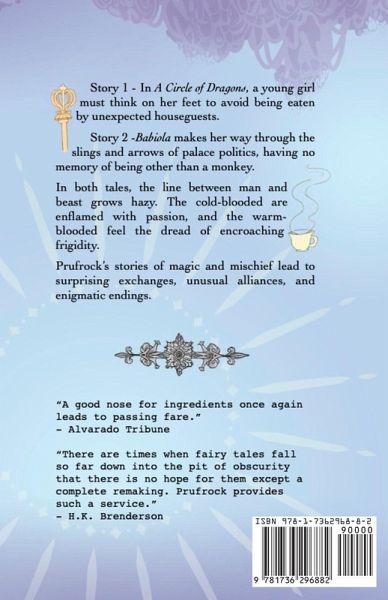 Story 1 - In A Circle of Dragons, a young girl must think on her feet to avoid being eaten by unexpected houseguests. Story 2 -Babiola makes her way through the slings and arrows of palace politics, having no memory of being other than a monkey. In both tales, the line between man and beast grows hazy. The cold-blooded are inflamed with passion, and the warm-blooded feel the dread of encroaching frigidity. Prufrock's stories of magic and mischief lead to surprising exchanges, unusual alliances, and enigmatic endings.