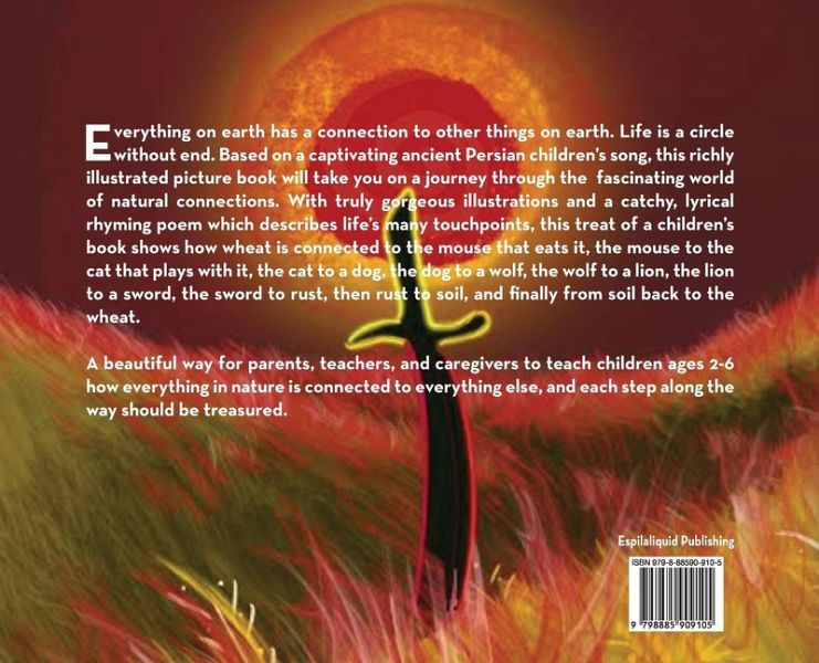 Everything on earth has a connection to other things on earth. Life is a circle without end. Based on a captivating ancient Persian children's song, this richly illustrated picture book will take you on a journey through the fascinating world of natural connections. With truly gorgeous illustrations and a catchy, lyrical rhyming poem which describes life's many touchpoints, this treat of a children's book shows how wheat is connected to the mouse that eats it, the mouse to the cat that plays with it, the cat to a dog, the dog to a wolf, the wolf to a lion, the lion to a sword, the sword to rust, then rust to soil, and finally from soil back to the wheat. A beautiful way for parents, teachers, and caregivers to teach children ages 2-6 how everything in nature is connected to everything else, and each step along the way should be treasured.