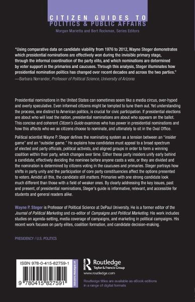 This concise and coherent Citizen's Guide examines who has power in presidential nominations and how this affects who we as citizens choose to nominate, and ultimately to sit in the Oval Office. Political scientist Wayne Steger defines the nominating system as a tension between an "insider game" and an "outsider game," depending on the unity and participation of the political party activists and officials, and the presidential aspirants who decide run. Either party insiders unify early behind a candidate, effectively deciding the nominee before anyone casts a vote, or they are divided and the nomination is determined by citizens in the caucuses and primaries. By clearly addressing the key issues, past and present, of presidential nominations, Steger's guide will be informative, relevant, and accessible for students and general readers alike.