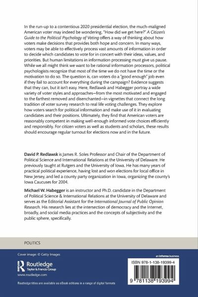 In the run-up to a contentious 2020 presidential election, the much-maligned American voter may indeed be wondering, "How did we get here?" A Citizen's Guide to the Political Psychology of Voting offers a way of thinking about how voters make decisions that provides both hope and concern. In many ways, voters may be able to effectively process vast amounts of information in order to decide which candidates to vote for in concert with their ideas, values, and priorities. But human limitations in information processing must give us pause. While we all might think we want to be rational information processors, political psychologists recognize that most of the time we do not have the time or the motivation to do so. The question is, can voters do a "good enough" job even if they fail to account for everything during the campaign? Evidence suggests that they can, but it isn't easy. Here, Redlawsk and Habegger portray a wide variety of voter styles and approaches-from the most motivated and engaged to the farthest removed and disenchanted-in vignettes that connect the long tradition of voter survey research to real life voting challenges. They explore how voters search for political information and make use of it in evaluating candidates and their positions. Ultimately, they find that American voters are reasonably competent in making well-enough informed vote choices efficiently and responsibly. For citizen voters as well as students and scholars, these results should encourage regular turnout for elections now and in the future.