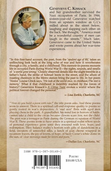 A Citrus Taste-A Memoir of Nazi-Occupied Paris by Genevieve C. Kissack nurtures seeds of memory into blossoms of quiet revelation. This beautiful study of human nature through the lens of war and years is a poignant and timeless collection of poetry, easily accessible to the reader and incredibly moving.