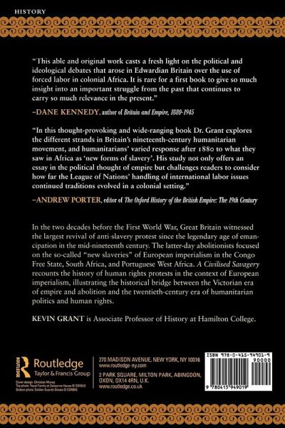 In the two decades before World War One, Great Britain witnessed the largest revival of anti-slavery protest since the legendary age of emancipation in the mid-nineteenth century. Rather than campaigning against the trans-Atlantic slave trade, these latter-day abolitionists focused on the so-called 'new slaveries' of European imperialism in Africa, condemning coercive systems of labor taxation and indentured servitude, as well as evidence of atrocities. A Civilized Savagery illuminates the multifaceted nature of British humanitarianism by juxtaposing campaigns against different forms of imperial labor exploitation in three separate areas: the Congo Free State, South Africa, and Portuguese West Africa. In doing so, Kevin Grant points out how this new type of humanitarianism influenced the transition from Empire to international government and the advent of universal human rights in subsequent decades.