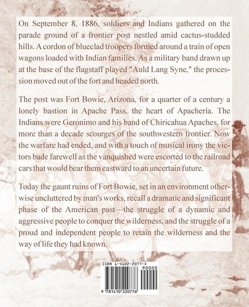 On September 8, 1886, soldiers and Indians gathered on the parade ground of a frontier post nestled amid cactus-studded hills. A cordon of blueclad troopers formed around a train of open wagons loaded with Indian families. As a military band drawn up at the base of the flagstaff played "Auld Lang Syne," the procession moved out of the fort and headed north. The post was Fort Bowie, Arizona, for a quarter of a century a lonely bastion in Apache Pass, the heart of Apacheria. The Indians were Geronimo and his band of Chiricahua Apaches, for more than a decade scourges of the southwestern frontier. Now the warfare had ended, and with a touch of musical irony the victors bade farewell as the vanquished were escorted to the railroad cars that would bear them eastward to an uncertain future. Today the gaunt ruins of Fort Bowie, set in an environment otherwise uncluttered by man's works, recall a dramatic and significant phase of the American past"Ythe struggle of a dynamic and aggressive people to conquer the wilderness, and the struggle of a proud and independent people to retain the wilderness and the way of life they had known.
