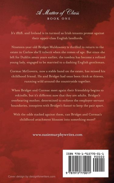 SHORTLISTED FOR THE IRISH CAP AWARDS 2023 'A beautifully written historical novel with characters who linger long after the last page is turned.' Hazel Gaynor, New York Times bestselling author of The Girl Who Came Home Society said they shouldn't fall in love... It's 1828, and Ireland is in turmoil as Irish tenants protest against their upper-class English landlords. Nineteen-year-old Bridget Muldowney is thrilled to return to the estate in Carlow she'll inherit when she comes of age. But since she left for Dublin seven years earlier, the tomboy has become a refined young lady, engaged to be married to a dashing English gentleman. Cormac McGovern, now a stable hand on the estate, has missed his childhood friend. He and Bridget had once been thick as thieves, running wild around the countryside together. When Bridget and Cormac meet again their friendship begins to rekindle, but it's different now that they are adults. Bridget's overbearing mother, determined to enforce the employer-servant boundaries, conspires with Bridget's fiancé to keep the pair apart. With the odds stacked against them, can Bridget and Cormac's childhood attachment blossom into something more? A Class Apart is the first book in Susie Murphy's historical fiction series A Matter of Class. The story continues in the second book, A Class Entwined. Praise for A Class Apart: 'Susie Murphy writes with intelligence and assurance and has a real talent for capturing an authentic sense of time and place. I look forward to reading more from this bright new voice in historical fiction.' Hazel Gaynor, New York Times bestselling author of The Girl Who Came Home 'I am completely blown away by this series...Simply outstanding.' Book Reviews for U, book reviewer 'Excellent characters and an interesting plot...The chemistry and romance between the two was well written and believable.' The Lit Bitch, book reviewer 'Romance, drama, suspense, and beautiful scenery reign supreme in A Class Apart...The story encompasses the real truths that the people in Ireland had to face in their time, weaving a heartrending tale that's impossible not to read.' Ashley O'Melia, author and freelance writer 'A richly detailed, historical tale of love against all odds...As you read this story you will fall deeper and deeper into the history of Ireland at the time, into the characters themselves, and into the emotions that are so vividly described that you cannot help but be caught up in it all too.' Books Of All Kinds, book reviewer 'For those of you who like Historical Fiction, you are in for a real treat...I devoured this book.' Coffee, Books and China Cups, book reviewer What readers are saying: 'The Irish Downton Abbey! Fabulous.' 'If it was possible to give 100 stars to this book, I would!' 'An absolute page turner.' 'I loved the book from start to finish.' 'A brilliant love story.' 'A hugely satisfying read.' 'Get ready to fall in love!' 'This is going to be a fantastic series of novels.' 'Superbly written.' 'I am already itching to read the next book in the series!'