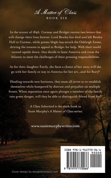 'I just love these characters...they truly feel like people I know.' Lisa Boyle, author of the Paddy Series An extraordinary bequest alters their fate... In the winter of 1846, Cormac and Bridget receive two letters that will change their lives forever. Lord Bewley has died and left Bewley Hall to Cormac, while potato blight has struck the Oakleigh Estate, driving the tenants to appeal to Bridget for help. With their world turned upside down, they decide to leave America and cross the Atlantic to meet the challenges of their pressing responsibilities. As for their daughter Emily, she faces a choice of her own: will she go with her family or stay in America for her art...and for Rory? Heading towards new horizons, they must all strive to re-establish themselves while hampered by distrust and prejudice on multiple fronts. When separation once again plunges a member of the family into grave danger, will they be able to distinguish friend from foe? A Class Inherited is the sixth book in Susie Murphy's historical fiction series A Matter of Class. The story continues in the seventh book, A Class Liberated. Praise for A Class Inherited: 'This lovely saga has more than earned its name...the book is a delight to read.' Historical Novel Society (May 2024 issue Historical Novels Review) 'Susie Murphy's writing and storytelling skill has once again kept me spellbound, as I stayed up way past my bedtime, telling myself just one more chapter.' Lisa Reads Books, book reviewer 'I am really experiencing such an array of emotions...This series is so worth your time.' Book Reviews for U, book reviewer 'Susie Murphy has a style that puts you at the heart of the book from the start giving you characters that you want to see succeed.' Mandie Griffiths, book reviewer at Jen Med's Book Reviews 'I was drawn into the story right away...Don't miss this series!' The Lit Bitch, book reviewer What readers are saying: ¿¿¿¿¿ 'My favorite book of the series so far!' ¿¿¿¿¿ 'Very strong women characters. I was totally engrossed.' ¿¿¿¿¿ 'This beautifully written series just keeps getting better.' ¿¿¿¿¿ 'Susie Murphy comes through again!' ¿¿¿¿¿ 'She has brought the characters to life and made the story real.' ¿¿¿¿¿ 'Every time I think I know what's coming next, it's a surprise.' ¿¿¿¿¿ 'I could not put this book down!' ¿¿¿¿¿ 'One of the best series of books I've ever read.' ¿¿¿¿¿ 'Wow, what a story, absolutely brilliant.' ¿¿¿¿¿ 'Fantastic read yet again and can't wait for the next one!'