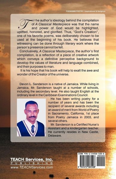 The author's ideology behind the compilation of A Classical Masterpiece was that the name and power of God would be highlighted, uplifted, honored, and glorified. Thus, "God's Creation," one of his favorite poems, was deliberately chosen to be used at the beginning of his book. He believes that witnessing can be done through literary work where the person's presence cannot be felt. Conclusively, the author's first compilation is a reflection of a piece of creative artwork which conveys a definitive perceptive background to develop the values of literature and language combined, and their purposes to man. It is his hope that his book will help to exalt the awe and wonder of the Creator of the universe.