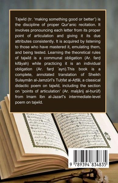 Tajw¿d (tr. 'making something good or better') is the discipline of proper Qur'anic recitation. It involves pronouncing each letter from its proper point of articulation and consistently giving it its due attributes. It is acquired by listening to those who have mastered it, emulating them, and being tested. Learning the theoretical rules of tajw¿d is a communal obligation (Ar. far¿ kif¿yah), while practicing it is an individual obligation (Ar. far¿ ¿ayn). This book is a complete, annotated translation of Sheikh Sulaym¿n al-Jamz¿r¿'s Tüfat al-A¿f¿l, a classical didactic poem on tajw¿d, including the section on 'points of articulation' (Ar. mä¿rij al-¿ur¿f) from Imam Ibn al-Jazar¿'s intermediate-level poem on tajw¿d.