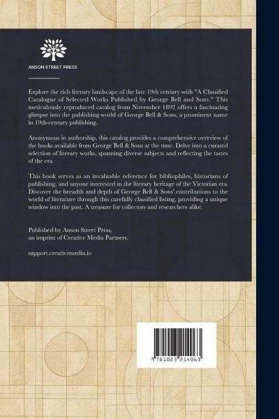 Explore the rich literary landscape of the late 19th century with "A Classified Catalogue of Selected Works Published by George Bell and Sons." This meticulously reproduced catalog from November 1892 offers a fascinating glimpse into the publishing world of George Bell & Sons, a prominent name in 19th-century publishing. Anonymous in authorship, this catalog provides a comprehensive overview of the books available from George Bell & Sons at the time. Delve into a curated selection of literary works, spanning diverse subjects and reflecting the tastes of the era. This book serves as an invaluable reference for bibliophiles, historians of publishing, and anyone interested in the literary heritage of the Victorian era. Discover the breadth and depth of George Bell & Sons' contributions to the world of literature through this carefully classified listing, providing a unique window into the past. A treasure for collectors and researchers alike. This work has been selected by scholars as being culturally important, and is part of the knowledge base of civilization as we know it. This work is in the public domain in the United States of America, and possibly other nations. Within the United States, you may freely copy and distribute this work, as no entity (individual or corporate) has a copyright on the body of the work. Scholars believe, and we concur, that this work is important enough to be preserved, reproduced, and made generally available to the public. We appreciate your support of the preservation process, and thank you for being an important part of keeping this knowledge alive and relevant.