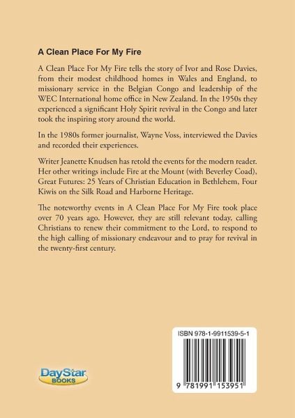 A Clean Place For My Fire tells the story of Ivor and Rose Davies, from their modest childhood homes in Wales and England, to missionary service in the Belgian Congo and leadership of the WEC International home office in New Zealand. In the 1950s they experienced a significant Holy Spirit revival in the Congo and later took the inspiring story around the world. In the 1980s former journalist, Wayne Voss, interviewed the Davies and recorded their experiences. Writer Jeanette Knudsen has retold the events for the modern reader. Her other writings include Fire at the Mount (with Beverley Coad), Great Futures: 25 Years of Christian Education in Bethlehem, Four Kiwis on the Silk Road and Harborne Heritage. The noteworthy events in A Clean Place For My Fire took place over 70 years ago. However, they are still relevant today, calling Christians to renew their commitment to the Lord, to respond to the high calling of missionary endeavour and to pray for revival in the twenty-first century.
