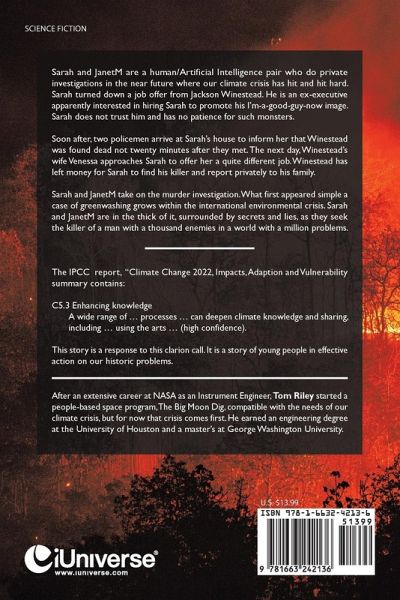 Sarah and JanetM are a human/Artificial Intelligence pair who do private investigations in the near future where our climate crisis has hit and hit hard. Sarah turned down a job offer from Jackson Winestead. He is an ex-executive apparently interested in hiring Sarah to promote his I'm-a-good-guy-now image. Sarah does not trust him and has no patience for such monsters. Soon after, two policemen arrive at Sarah's house to inform her that Winestead was found dead not twenty minutes after they met. The next day, Winestead's wife Venessa approaches Sarah to offer her a quite different job. Winestead has left money for Sarah to find his killer and report privately to his family. Sarah and JanetM take on the murder investigation. What first appeared simple a case of greenwashing grows within the international environmental crisis. Sarah and JanetM are in the thick of it, surrounded by secrets and lies, as they seek the killer of a man with a thousand enemies in a world with a million problems. The IPCC report, "Climate Change 2022, Impacts, Adaption and Vulnerability summary contains: C5.3 Enhancing knowledge A wide range of ... processes ... can deepen climate knowledge and sharing, including ... using the arts ... (high confidence). This story is a response to this clarion call. It is a story of young people in effective action on our historic problems.