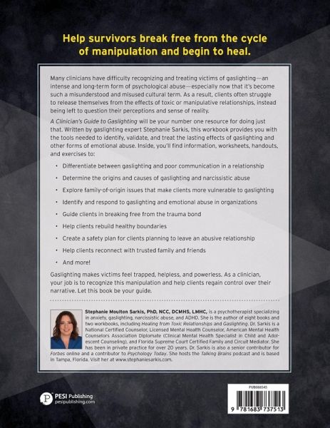 Help survivors break free from the cycle of manipulation and begin to heal. Many clinicians have difficulty recognizing and treating victims of gaslighting--an intense and long-term form of psychological abuse--especially now that it's become such a misunderstood and misused cultural term. As a result, clients often struggle to release themselves from the effects of toxic or manipulative relationships, instead being left to question their perceptions and sense of reality. A Clinician's Guide to Gaslighting will be your number one resource for supporting and empowering these clients. Written by gaslighting expert Stephanie Moulton Sarkis, this workbook provides you with the tools needed to identify, validate, and treat the lasting effects of gaslighting and other forms of emotional abuse. Inside, you'll find information, worksheets, handouts, and exercises to: * Differentiate between gaslighting and poor communication in a relationship * Determine the origins and causes of gaslighting and narcissistic abuse * Explore family-of-origin issues that make clients more vulnerable to gaslighting * Identify and respond to gaslighting and emotional abuse in organizations * Guide clients in breaking free from the trauma bond * Help clients rebuild healthy boundaries * Create a safety plan for clients planning to leave an abusive relationship * Help clients reconnect with trusted family and friends * And more! Gaslighting makes victims feel trapped, helpless, and powerless. As a clinician, your job is to recognize this manipulation and help clients regain control over their narrative. Let this book be your guide.