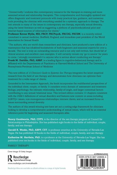"Unreservedly I endorse this contemporary resource for the therapist-in-training and more seasoned sexual and relationship therapists. This comprehensive and thoroughly updated text offers diagnostic and treatment protocols with many practical tips, guidance, and numerous tools providing the clinician with everything needed for a systemic approach to therapy. The text attends to many of the issues in contemporary sex therapy, especially sexual diversity, using the latest literature as well as suggesting a plethora of psychoeducational print and internet-based sources of information for clients." - Professor Kevan Wylie, MD, FRCP, FRCPsych, FRCOG, FECSM, is a recently retired consultant in sexual medicine, Sheffield, England and immediate past president of the World Association for Sexual Health.