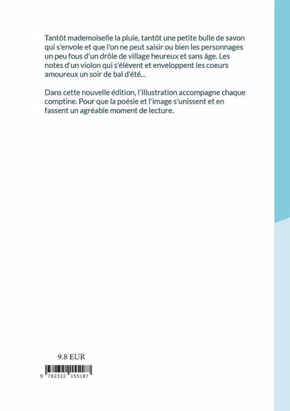 Tantôt mademoiselle la pluie, tantôt une bulle de savon qui s'envole et que l'on ne peut saisir ou bien les personnages un peu fous d'un drôle de petit village heureux et sans âge. Les notes d'un violon qui s'élèvent et enveloppent les coeurs amoureux un soir de bal d'été.Dans cette nouvelle édition, l'illustration accompagne chaque comptine. Pour que la poésie et l'image s'unissent et en fassent un agréable moment de lecture.