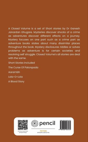 A Closed Volume is a set of Short stories by Dr Ganesh Janardan Ghugare. Mysteries discover shocks of a crime as adventures discover different effects on a journey. Mystery focuses on one part such as a crime part as adventure books states about many dissimilar places throughout the book. Mystery disclosures riddles or solves problems as adventure is for certain societies and resolving self struggle. Closed Volume's all stories are deal with the same. Short Stories included The Curse Of Patonpada Aarambh Lola-O-Lola A Blood Story