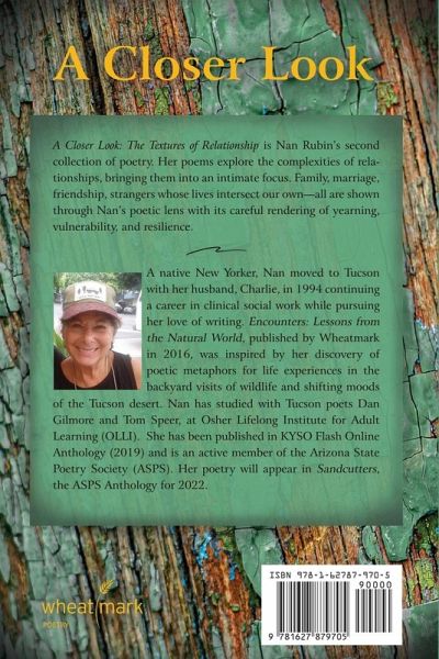A Closer Look: The Textures of Relationship is Nan Rubin's second collection of poetry. Her poems explore the complexities of relationships, bringing them into an intimate focus. Family, marriage, friendship, strangers whose lives intersect our own -- all are shown through Nan's poetic lens with its careful rendering of yearning, vulnerability, and resilience.