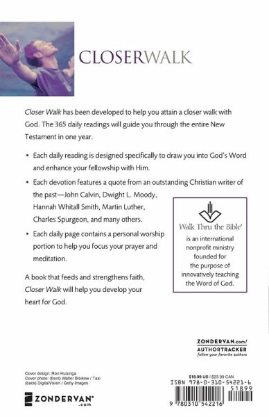 Closer Walk has been developed to help you attain a closer walk with God. The 365 daily readings will guide you through the entire New Testament in one year. - Each daily reading is designed specifically to draw you into God's Word and enhance your fellowship with Him. - Each devotion features a quote from an outstanding Christian writer of the past--John Calvin, Dwight L. Moody, Hannah Whitall Smith, Martin Luther, Charles Spurgeon, and many others. - Each daily page contains a personal worship portion to help you focus your prayer and meditation. A book that feeds and strengthens faith, Closer Walk will help you develop your heart for God.