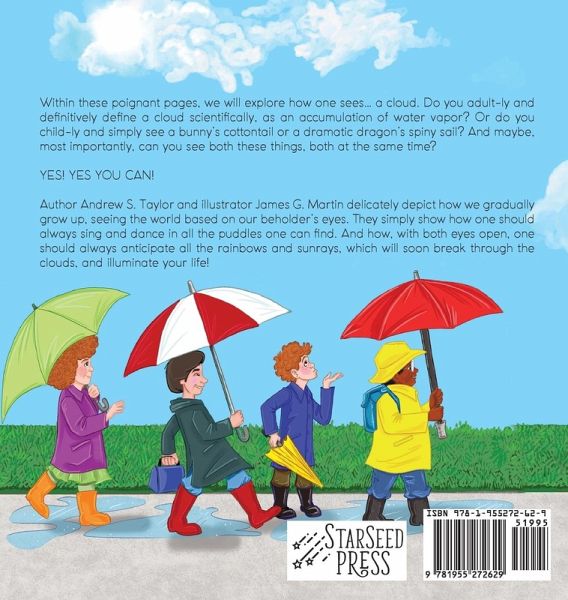 Within these poignant pages, we will explore how one sees... a cloud. Do you adult-ly and definitively define a cloud scientifically, as an accumulation of water vapor? Or do you child-ly and simply see a bunny's cottontail or a dramatic dragon's spiny sail? And maybe, most importantly, can you see both these things, both at the same time? YES! YES YOU CAN! Author Andrew S. Taylor and illustrator James G. Martin delicately depict how we gradually grow up, seeing the world based on our beholder's eyes. They simply show how one should always sing and dance in all the puddles one can find. And how, with both eyes open, one should always anticipate all the rainbows and sunrays, which will soon break through the clouds, and illuminate your life!
