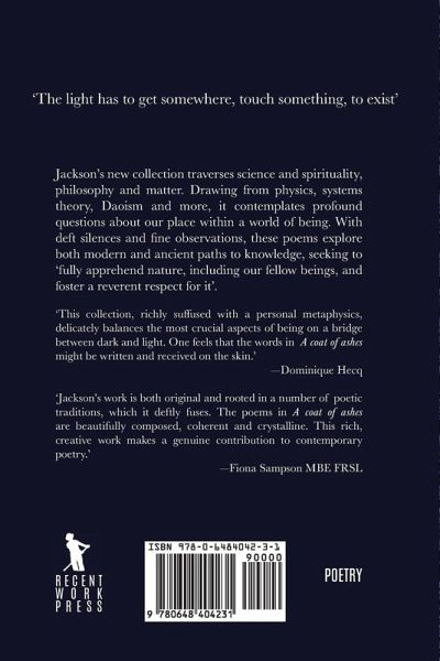 Traversing physics and spirituality, philosophy and matter, Jackson's new collection asks profound questions about our place within a world of being. With deft silences and fine observations, these poems 'welcome both scientific and older ways of knowing in order to more fully apprehend nature, our fellow beings, and foster a reverent respect for it.