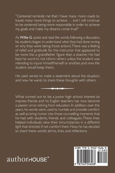 Centered reminds me that I have many more roads to travel, many more things to achieve . . . and I will continue to be centered, being more responsible in order to achieve my goals and make my dreams come true! As Willie G. spoke and read the words, following a discussion, his students began to understand what they had done wrong or why they were taking those actions. There was a feeling of relief and gratitude for this instructor that appeared to be more like a grandfather figure than a teacher. He had kept his word to not inform others unless the student was intending to injure himself/herself or another, and now the student would keep theirs. He used verses to make a statement about the situation, and now he wants to share these thoughts with others.
