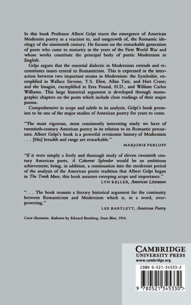 In this book Albert Gelpi traces the emergence of American Modernist poetry as a reaction to, and outgrowth of, the Romantic ideology of the nineteenth century. He focuses on the remarkable generation of poets who came to maturity in the years of the First World War and whose works constitute the principal body of poetic Modernism in English. Gelpi argues that the essential dialectic in Modernism extends and reconstitutes issues central to Romanticism. This is expressed in the interaction between two important strains in Modernism: the Symbolist exemplified in Wallace Stevens, T. S. Eliot, Allan Tate, and Hart Crane; and the Imagist, exemplified in Ezra Pound, H. D. and William Carlos Williams.