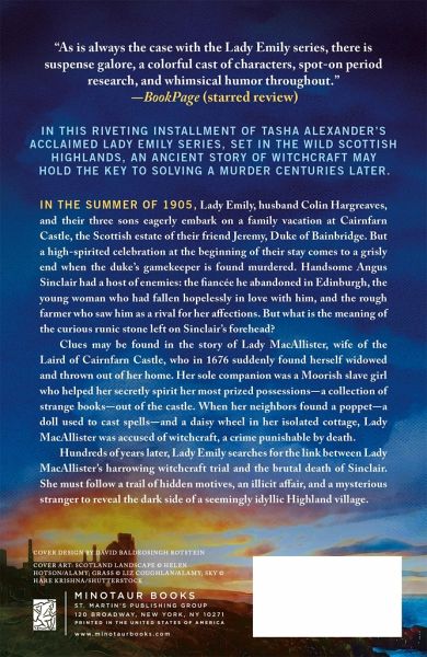 In this new installment of Tasha Alexander's acclaimed Lady Emily series set in the wild Scottish highlands, an ancient story of witchcraft may hold the key to solving a murder centuries later. In the summer of 1905, Lady Emily, husband Colin Hargreaves, and their three sons eagerly embark on a family vacation at Cairnfarn Castle, the Scottish estate of their friend Jeremy, Duke of Bainbridge. But a high-spirited celebration at the beginning of their stay comes to a grisly end when the duke's gamekeeper is found murdered. Handsome Angus Sinclair had a host of enemies: the fiancée he abandoned in Edinburgh, the young woman who had fallen hopelessly in love with him, and the rough farmer who saw him as a rival for her affections. But what is the meaning of the curious runic stone left on Sinclair's forehead? Clues may be found in the story of Lady MacAllister, wife of the Laird of Cairnfarn Castle, who in 1676 suddenly found herself widowed and thrown out of her home. Her sole companion was a Moorish slave girl who helped her secretly spirit her most prized possessions-a collection of strange books-out of the castle. When her neighbors found a poppet-a doll used to cast spells-and a daisy wheel in her isolated cottage, Lady MacAllister was accused of witchcraft, a crime punishable by death. Hundreds of years later, Lady Emily searches for the link between Lady MacAllister's harrowing witchcraft trial and the brutal death of Sinclair. She must follow a trail of hidden motives, an illicit affair, and a mysterious stranger to reveal the dark side of a seemingly idyllic Highland village.