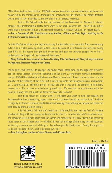 President Franklin D. Roosevelt signed Executive Order 9066 on February 19, 1942, resulting in a cataclysmic series of events affecting all persons of Japanese ancestry then residing on the West Coast of the United States. So calamitous were these actions that a noted scholar asserted that this action constitutes "the defining event in the history of Japanese Americans."What does this have to do with a book of poetry titled A COLD WIND FROM IDAHO? Those Americans familiar with the Pacific Northwest Japanese American World War II experience will understand the imagery wrought by the title as being both evocative and apt. The metaphor of freezing winter winds chilling the body and then entering the soul of those affected conveys fittingly how the Japanese Issei and Japanese American Nisei encountered, braved, and then survived the cold iciness of Idaho's winters while they were huddled in a primitive American barbed wire concentration camp.