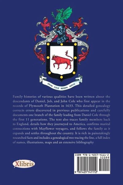 Family history of various qualities have been written about the dependents of Daniel, Job and John Cole who first appear in the records of Plymouth Plantation in 1633. This detailed genealogy corrects errors discovered in previous publications and carefully documents one branch of the family leading from Daniel Cole through the first 11 generations. The text also traces family members back to England, details how they journeyed to America, confirms marital connections with several Mayflower voyagers, and follows the family as it expands and settled throughout the country. It is rich in painstakingly researched facts and includes a genealogical tree tracing the line, a full index of names, illustrations, maps and extensive bibliography. The work, researched over a 10 year period, makes use of more than 80 references listed in the bibliography. In addition to the Cole family, particulars on the Chandler, Collier, Cullen, Doane, Fuller, Hopkins, Hyde, Kimmich, Lyons, McCrimmon, Murray, Rogers, Smalley, Snow and Taylor families are found in its pages, along with facts on many other families that settled in the northeastern United States. This scholarly work will be of benefit to every genealogical researcher, serving as a valuable reference and research tool.